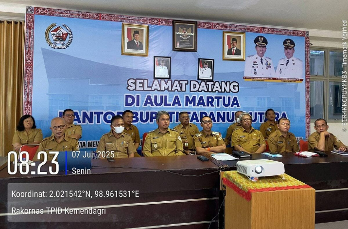 Bupati dan Wakil Bupati Tapanuli Utara Dr. Jonius Taripar Parsaoran Hutabarat, S.Si, M.Si dan Dr. Deni Lumbantoruan, M.Eng menghadiri Rapat Koordinasi Pengendalian Inflasi Daerah, strategi menjaga pertumbuhan ekonomoni dan dukungan Pemerintah Daerah dalam Program 3 Juta Rumah secara daring yang dipimpin langsung oleh Menteri Dalam Negeri, bertempat di Aula Martua Kantor Bupati Tapanuli Utara, Senin 07 Juli 2025