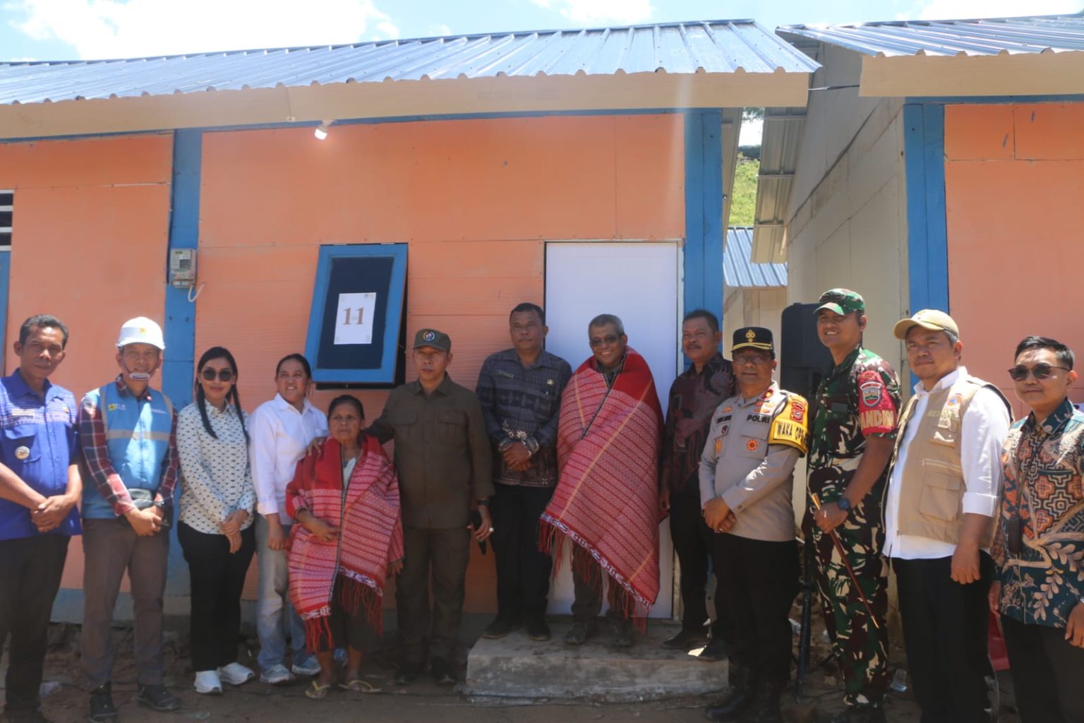 Pada agenda yang digelar di Desa Sibalanga Kecamatan Adian Koting, Bupati Jonius didampingi Direktur Pengembangan Strategi Penanggulangan Bencana BNPB Agus Wibowo menyerahkan kunci rumah siap huni kepada tiga warga perwakilan dari total 40 unit Huntara untuk warga penyintas bencana alam banjir dan longsor.
