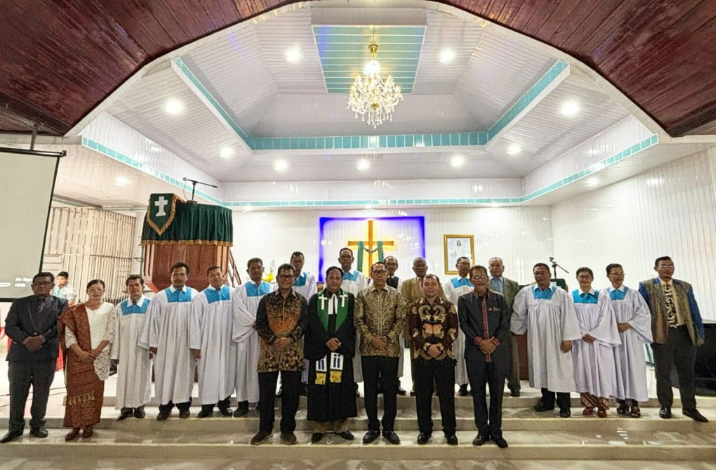 Ibadah dihadiri pimpinan perangkat daerah yang mendampingi Bupati. Pemerintah mengapresiasi sambutan jemaat dan berharap dukungan doa berlanjut.