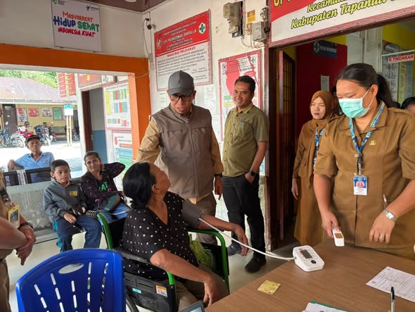 Bupati Tapanuli Utara melakukan peninjauan langsung terhadap alur pelayanan kesehatan di Puskesmas Sarulla, Kecamatan Pahae Jae, pada Senin (13/04/2026).