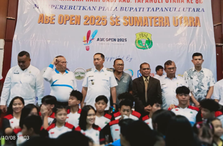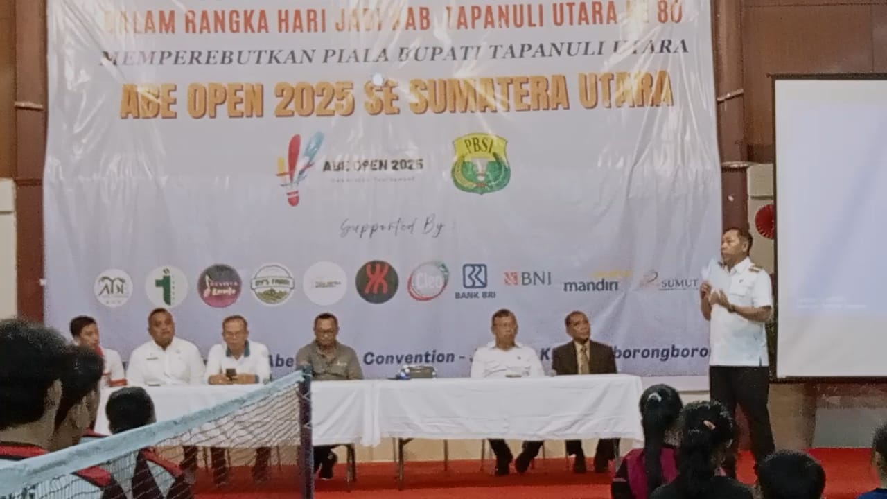 Bupati Tapanuli Utara, Dr. Jonius T.P. Hutabarat, S.Si., M.Si, secara resmi membuka Turnamen Bulutangkis ABE Open 2025 yang memperebutkan Piala Bupati Tapanuli Utara di ABE Hotel, Siborongborong, Rabu (8/10).