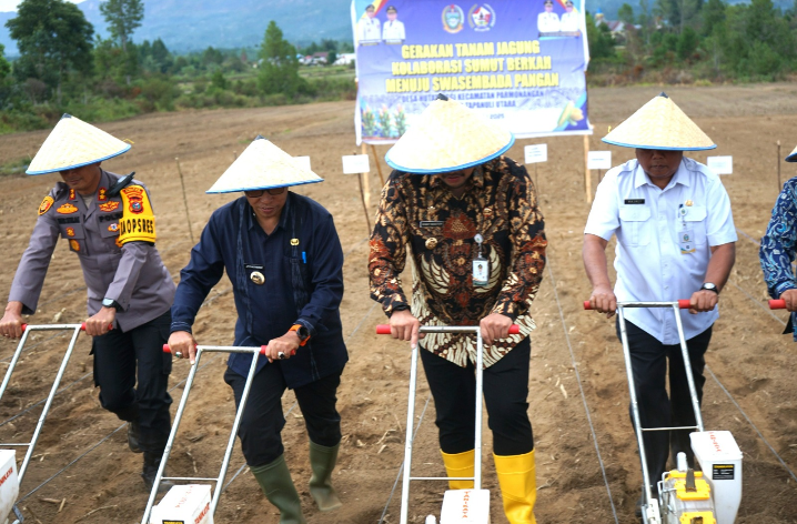 Bupati Tapanuli Utara, Dr. Jonius Taripar Parsaoran Hutabarat, S.Si, M.Si yang didampingi istri Neny Angelina Purba, Kapolres Taput AKBP Ernis Sitinjak, SH, S. IK, Dandim 0210/TU Letkol Kav Ronald Tampubolon, SH. M. Han bersama Gubernur Sumatera Utara, Moh. Bobby Afif Nasution melakukan Gerakan Tanam Jagung Kecamatan Parmonangan yang merupakan Kolaborasi Sumut Berkah Menuju Swasembada Pangan di Desa Hutatinggi Kecamatan Parmonangan, Kabuapaten Tapanuli Utara. Jumat (25/7/2025).