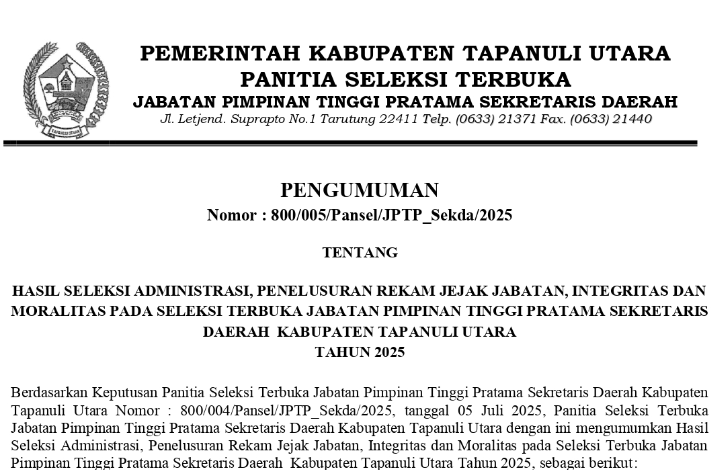 Hasil Seleksi Administrasi, Penelusuran rekam Jejak Jabatan, Integritas dan Moralitas pada Seleksi Terbuka Jabatan Pimpinan Tinggi Pratama Sekretaris Daerah Kabupaten Tapanuli Utara Tahun 2025