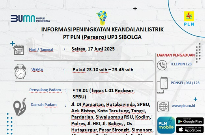 PLN UP3 Sibolga akan melakukan pemadaman listrik sementara dalam rangka “peningkatan keandalan listrik” melalui perbaikan darurat jumperan SKTM di Simpang 4 Kota Tarutung.
