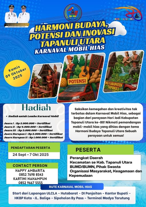 Pemerintah Kabupaten Tapanuli Utara mengajak seluruh masyarakat untuk hadir dan menyaksikan secara langsung kemeriahan Karnaval Mobil Hias Taput 2025, sebagai bagian dari perayaan Hari Jadi ke-80 yang penuh kebersamaan, budaya, dan semangat pembangunan.