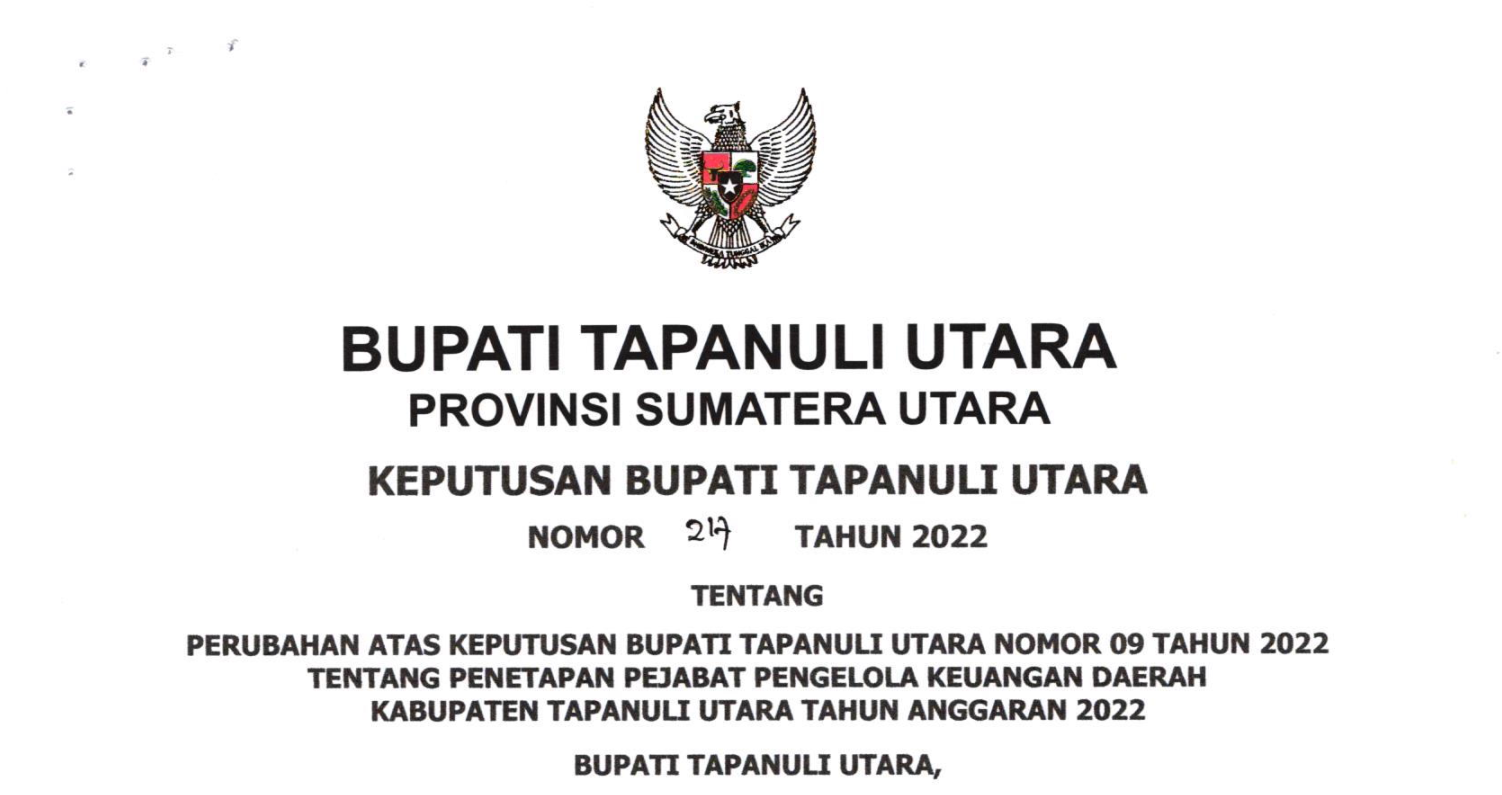 Keputusan Bupati Tapanuli Utara Nomor 271 Tahun 2022 Tentang Perubahan Kedua Atas Keputusan Bupati Tapanuli Utara Nomor 09 Tahun 2022 Tentang Penetapan Pejabat Pengelola Keuangan Daerah Kabupaten Tapanuli Utara Tahun Anggaran 2022