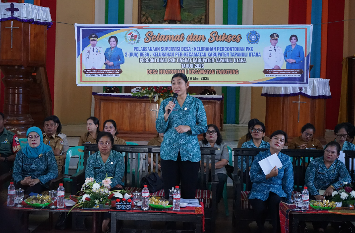 Ketua II Bidang Pendidikan dan Peningkatan Ekonomi Keluarga TP PKK Taput Ny. Lisa Deni Lumbantoruan br. Malau memimpin pelaksanakan kegiatan Pembinaan Desa Percontohan PKK 2 (Dua) Desa per-kecamatan Kabupaten Tapanuli Utara Tahun 2025 di Desa Hutauruk, Kecamatan Tarutung (Senin, 19 Mei 2025).