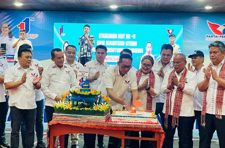 Bupati Tapanuli Utara sekaligus Ketua DPW Perindo Sumut Dr. Jonius Taripar Parsaoran Hutabarat S. Si, M. Si bersama Wakil Bupati Dr. Deni Parlindungan Lumbantoruan, M. Eng menghadiri Syukuran HUT Perindo ke-11 se-Sumut, bertempat di Gedung Kesenian Sopo Partungkoan, Tarutung (Minggu, 26 Oktober 2025).