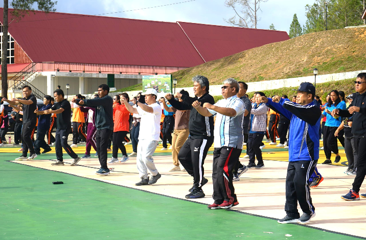 Wakil Bupati Tapanuli Utara Dr. Deni Lumbantoruan, M.Eng bersama jajaran ASN di lingkungan Pemerintah Kabupaten Tapanuli Utara mengikuti kegiatan senam pagi bersama yang merupakan agenda rutin Pemkab setiap Jumat pada minggu kedua setiap bulannya bertempat di Pelataran Parkir Menara Pandang Salib Kasih, Tarutung, Jumat (18/7/2025).