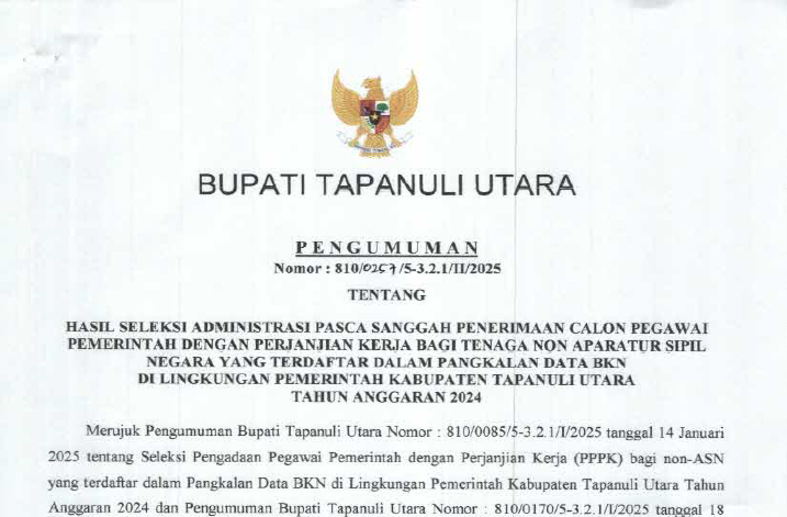 PENGUMUMAN HASIL SELEKSI ADMINISTRASI PASCA SANGGAH PENERIMAAN CALON PEGAWAI PEMERINTAH KABUPATEN TAPANULI UTARA
