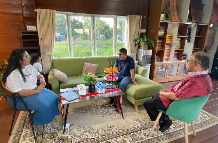 Penjabat (Pj) Bupati Tapanuli Utara, Dr. Dimposma S.Sos, M.A.P mengunjungi galeri Dame ulos milik Reni Manurung di Saitnihuta, Kecamatan Tarutung, Kamis (11/07/2024).