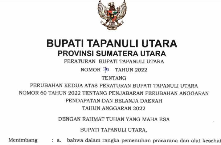 PERATURAN BUPATI TAPANULI UTARA NOMOR 70 TAHUN 2022 TENTANG PERUBAHAN KEDUA ATAS PERATURAN BUPATI TAPANULI UTARA NOMOR 60 TAHUN 2022 TENTANG PENJABARAN PERUBAHAN ANGGARAN PENDAPATAN DAN BELANJA DAERAH TAHUN ANGGARAN 2022