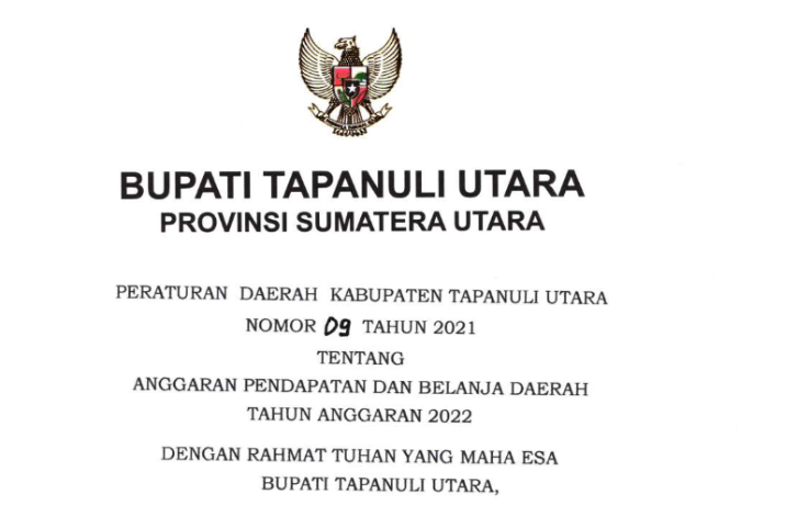 PERATURAN DAERAH KABUPATEN TAPANULI UTARA NOMOR 09 TAHUN 2021 TENTANG ANGGARAN PENDAPATAN DAN BELANJA DAERAH ANGGARAN TAHUN 2022