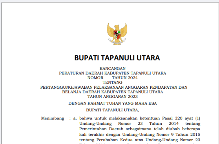 PERATURAN DAERAH KABUPATEN TAPANULI UTARA NOMOR 1 TAHUN 2024 TENTANG PERTANGGUNGJAWABAN PELAKSANAAN ANGGARAN PENDAPATAN DAN BELANJA DAERAH KABUPATEN TAPANULI UTARA TAHUN ANGGARAN 2023