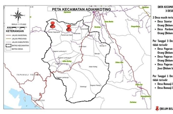 Di Kecamatan Adiankoting, akses menuju sejumlah desa masih menjadi tantangan besar akibat kerusakan jalan dan banyaknya titik longsor. Hingga saat ini, terdapat dua desa yang masih terisolir, yaitu Desa Siantar Naipospos dengan sekitar 1.028 jiwa dan Desa Pardomuan Nauli dengan sekitar 702 jiwa. Meski demikian, percepatan pembukaan akses berhasil membuat tiga desa lainnya yaitu Pagaran Lambung IV sekitar 821 jiwa, Pagaran Lambung III sekitar 783 jiwa dan Pagaran Lambung I sekitar 1266 jiwa tidak lagi terisolir per 3 Desember 2025.