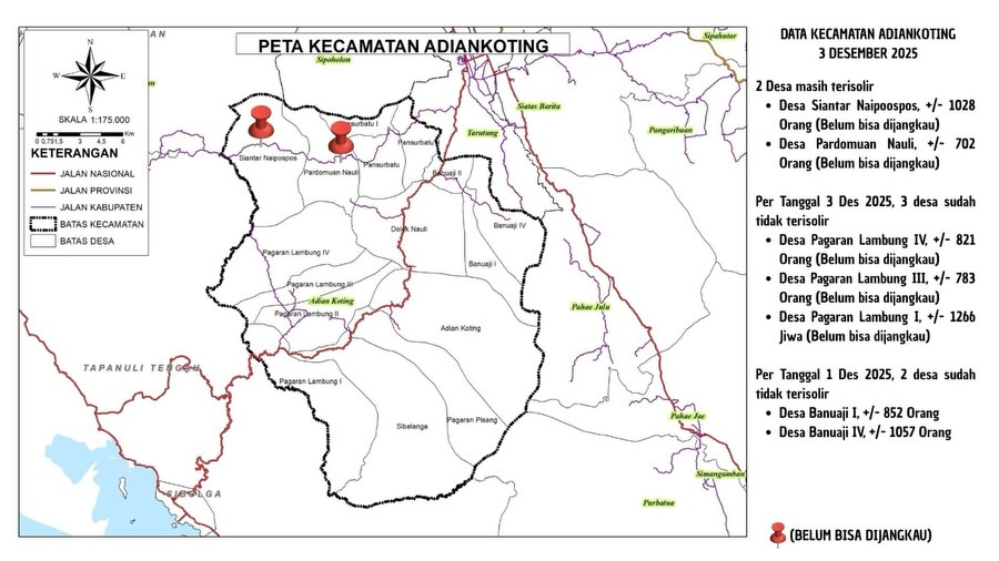 Selain itu, pada 1 Desember 2025 dua desa lainnya di Kecamatan Adiankoting, yakni Banuaij I sekitar 852 jiwa dan Banuaij IV sekitar 1057 jiwa, juga telah berhasil dijangkau setelah sebelumnya terisolir total. Pembukaan akses ini memungkinkan distribusi bantuan logistik dilakukan lebih cepat, termasuk kebutuhan pokok, makanan siap saji, layanan kesehatan bergerak, serta pendataan lanjutan warga terdampak.