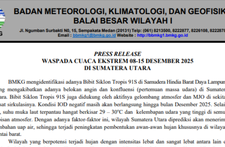 PRESS RELEASE WASPADA CUACA EKSTREM 08-15 DESEMBER 2025 DI SUMATERA UTARA