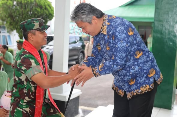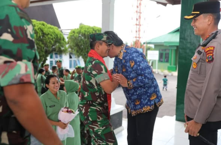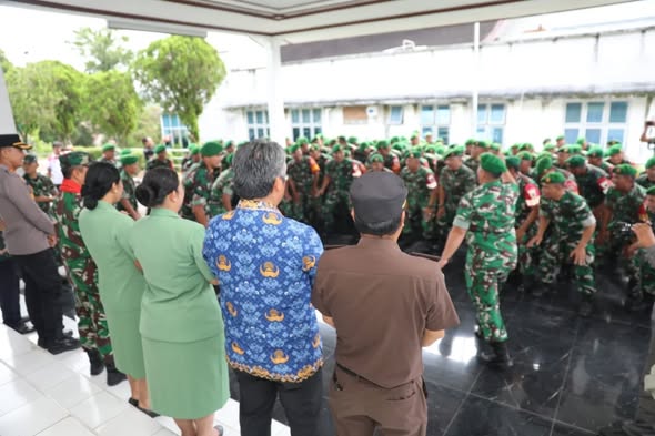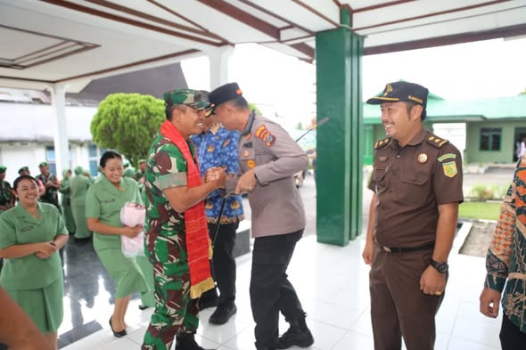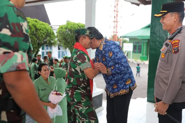 Wakil Bupati Tapanuli Utara Dr. Deni Parlindungan Lumbantoruan, M.Eng bersama Dandim 0210/Tapanuli Utara Letkol Kav Ronald Tampubolon, S.H., M.Han dan Kapolres Tapanuli Utara AKBP Ernis Sitinjak, S.H., S.I.K menyambut kunjungan Komandan Korem 023/KS Kolonel Inf Iwan Budiarso, S.Sos., M.Han beserta Ketua Persit KCK Koorcab Rem 023 PD I/BB Ny. Miya Iwan B di Kodim 0210/Tapanuli Utara, Tarutung, Jumat (17/04/2026).