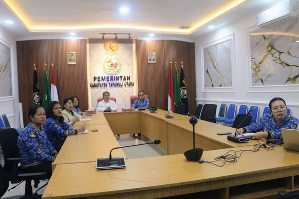 Wakil Bupati Tapanuli Utara Dr. Deni Lumbantoruan pimpin rapat melalui zoom meeting terkait persiapan Rakernas V MPK di Indonesia yang diikuti Ketua Umum MPK Indonesia Handi Irawan, Ketua MPK Wilayah Sumut Aceh Dr. RE. Nainggolan dan dipandu host Asisten Administrasi Umum Binhot Aritonang, di Ruang Rapat Aula Mini Kantor Bupati Taput, Jumat (17/04-2026).